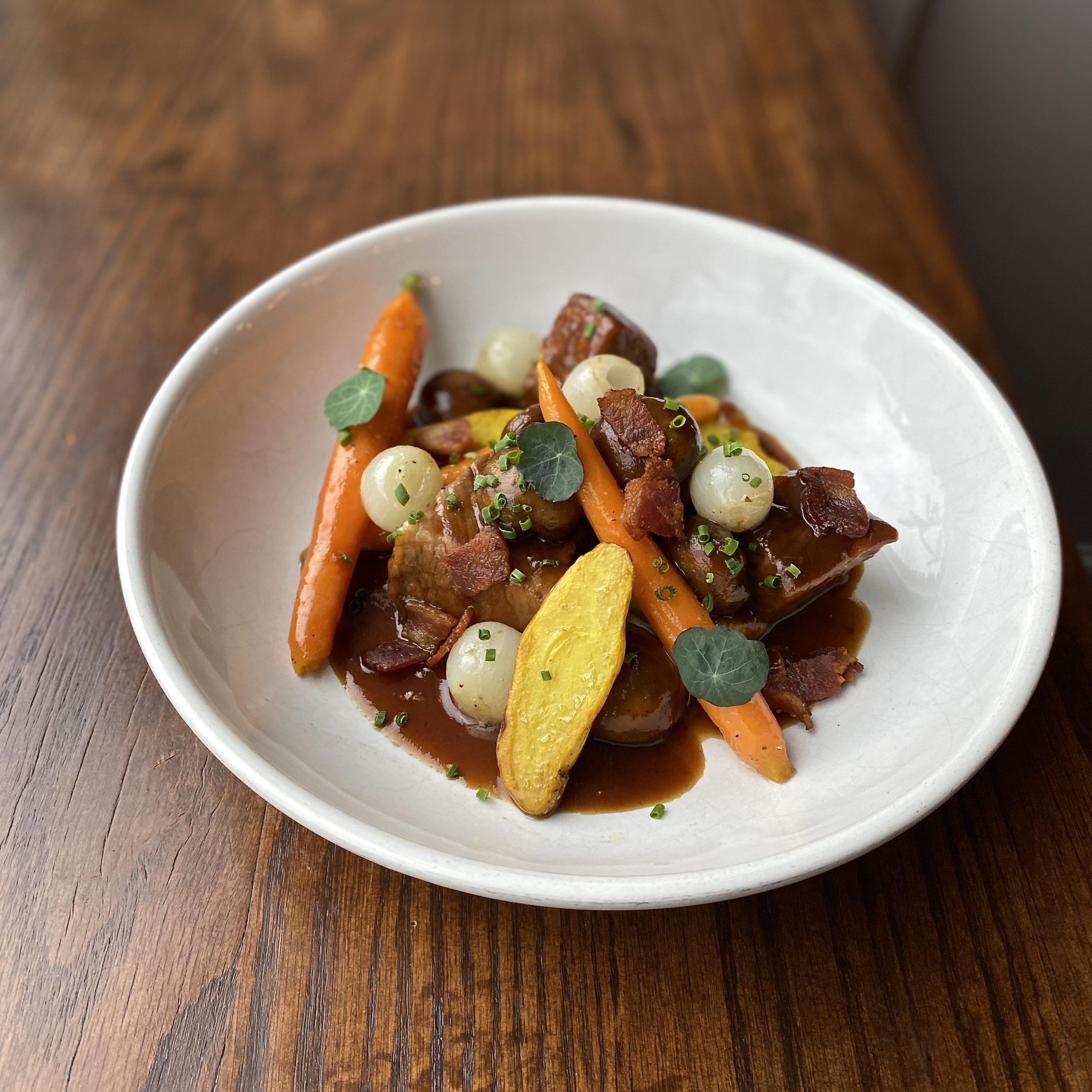 Tender Red Wine Braised Beef in Rich Bone stock with Mushrooms, Pearl Onions, and Baby Carrots #getinmybelly